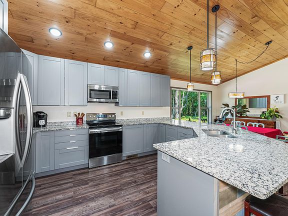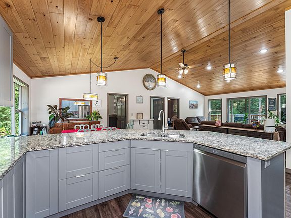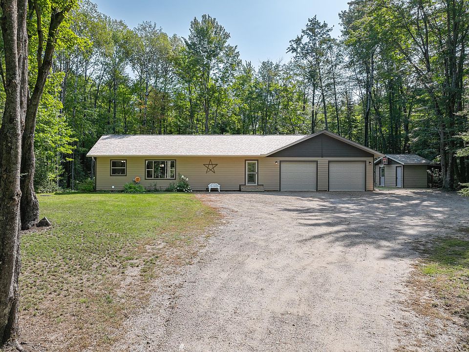 Quality-built home situated on a 2.58-acre parcel in Sugar Camp. The open-concept kitchen/dining/living room is accented with tongue and grove cathedral ceilings and laminate flooring throughout the home. Master bedroom suite, 2 bedrooms, full bath, pantry, and laundry with stackable washer/dryer complete the main floor. The basement features a family room with a dry bar area, playroom, den, full bath, utility room, and a 9x9 prep room. 2-car attached garage, backyard deck, fenced-in garden and shed/chicken coop complete this home. (Smartboard siding)