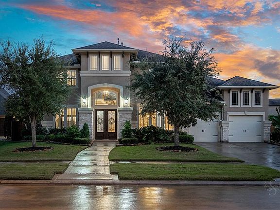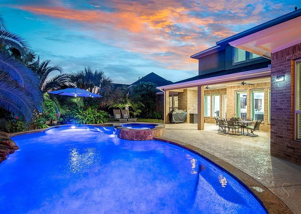 STUNNING Trendmaker home in Cross Creek Ranch located on an oversized lot & showcases a resort-like backyard featuring a POOL & SPA w/spectacular landscaping, covered patio and built-in firepit! 5 bedrooms (2 DOWN), 4 full bath, 1 half bath & 3 car tandem garage! Beautiful stone & stucco front elevation, high ceilings, recessed lighting, crown molding & beautiful detailed architecture throughout! Impressive grand entry features hardwood flooring & spiral staircase w/ornamental wrought iron spindles! Formal dining room w/coffered ceiling, study w/French doors and spacious gourmet kitchen provides granite island & breakfast bar, DOUBLE OVENS & SS appliances! Bright, inviting family room w/wall of windows providing a breathtaking view of the back yard paradise! Primary suite w/bay windows, His & Hers closets & whirlpool bath! Large game room and media room up! This is a must see! Make an appointment today!