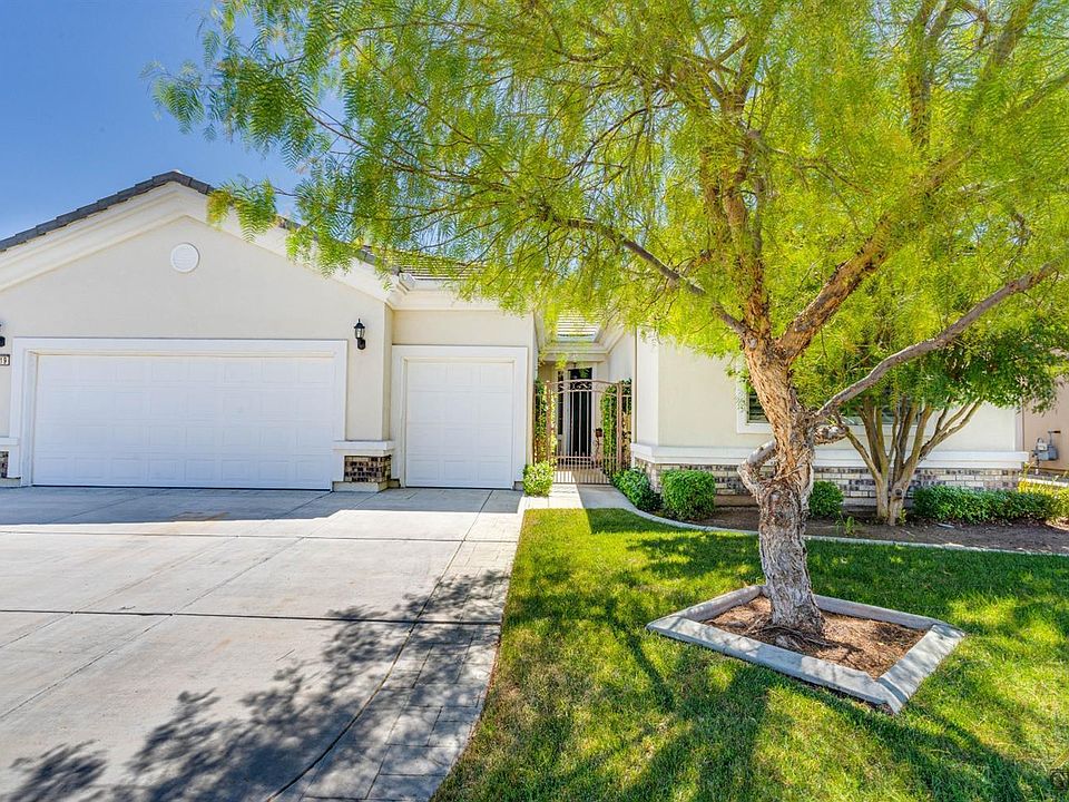 Lovely Retreat in the gated community of Solera 55+! 2 bedroom+Office 2.5 bath, open concept floorplan. So much attention to detail amenities include; custom built-ins, Shutters, crown molding, Paid for Solar & so much more. A spacious greatroom, dining and kitchen space features a cozy fireplace w/rock face and chunky wood mantel & built-in entertainment center. Spacious kitchen features a prep island & breakfast bar, SS appliances, granite counters & backsplash, lots of cabinets w/pantry and double French doors that extend living out onto one of two covered patios. An office space w/built-in desk & cabinets.The master has French doors out to the second covered patio Master bath has a custom-detailed walk-in wardrobe. Low maintenance exterior- custom shed, rock waterfall, wrought iron front gate, retractable screen doors & garage cabinets.