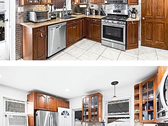 This lovely and bright, fully remodeled home includes front parking, a private rear patio for relaxing and entertaining, and a detached garage with ample storage space. The first floor features beautiful hardwood flooring, a foyer with large closet, and separate living and dining areas with archways and a charming stained glass window. The rear-facing kitchen includes a breakfast bar, modern stainless appliances and backsplash, front-load washing machine, numerous solid wood cabinets and granite countertops. The second floor continues with hardwood flooring, modern lighting and ceiling fans throughout, as well as a luxurious bathroom with Carrara marble and a jacuzzi tub. The large front-facing primary bedroom includes built-in solid wood cabinets, drawers and mirrored vanity nook, the second rear-facing bedroom and hallway both include large closets, and the middle bedroom is the ideal guest room. The fully-finished basement -- the perfect home office and recreation room -- is accessed via the kitchen or rear patio and features multiple windows, modern gray ceramic tile, wet-bar with numerous cabinets, quartz countertop and stainless and stone backsplash, plus another sleek, full bathroom with a walk-in shower. This well-maintained, move-in ready home is very close to transportation (2/5 train; B6, B11, B41, B44, B103 bus lines), Brooklyn College, plus loads of dining and shopping options (Target, Home Goods, Aldi).