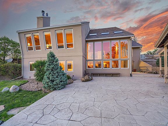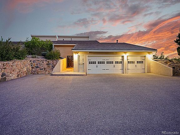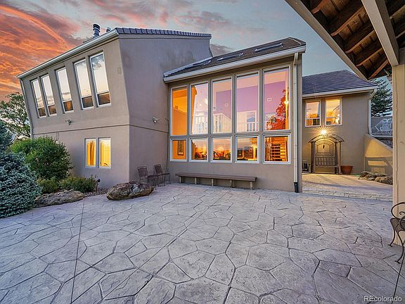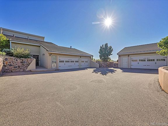 Welcome to 572 W. Oak Hills Drive, an exquisite custom Castle Rock dream home set on a 5-acre lot, located in the prestigious community of Oak Hills! Boasting and attached 3-car garage and a detached oversized 2-car garage, a resort-style patio with unobstructed views of Pikes Peak across the front range, unique and inviting architecture, and abundant natural light throughout, this home blends a world-class panoramic Colorado backdrop with undeniable warmth. Nearly 4,400 sq ft of living space is reflected in the home's generous three-bedroom, three bath floorplan. Light hardwood floors pair with floor-to-ceiling windows to create a living space that feels both ethereal and grounded. You'll feel at one with nature surrounded by private views of mountain and meadow from every room. In the kitchen, stainless steel appliances pair with a breakfast nook and two eat-in bars, ensuring guests will always have a seat at your table. Host a holiday meal in the formal dining room or enjoy a good book in front of the fireplace in the family room while watching the sun set over the mountains. An exceptional sunroom invites you to bask in the Colorado sunshine year-round under bright natural light from a wall of windows and beaming skylights. The main-level primary bedroom is an impressive retreat, featuring a spacious 20X20 layout, three generous closets including a walk-in, and a sprawling 5-piece bath. Convenient main-level office and half-bath, perfect for guests! The home's incredible walk-out basement creates space for recreation and entertaining, with room for a home gym, family room, two bedrooms and a full bathroom. Outside, you'll find a beautifully landscaped outdoor oasis featuring a sprawling patio, expansive gazebo/pergola and unobstructed views for miles and miles. Unwind with the sounds of a babbling outdoor water feature or the crackle of a fire pit. Several outdoor seating areas and enviable open space invite outdoor entertaining.