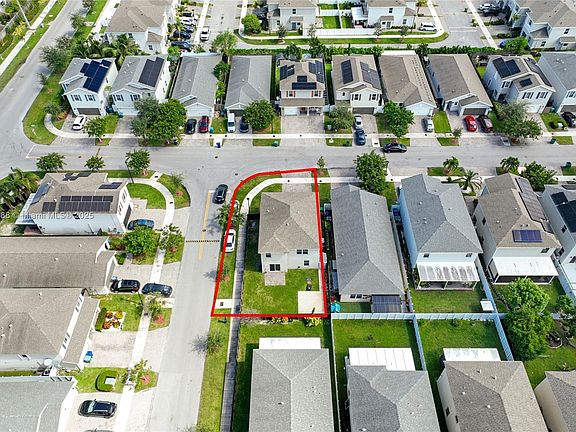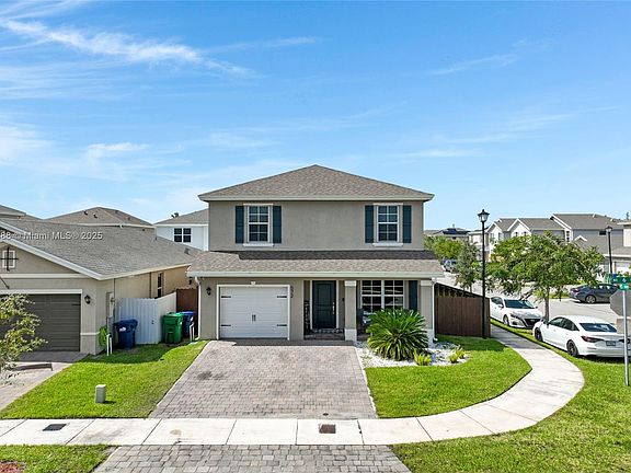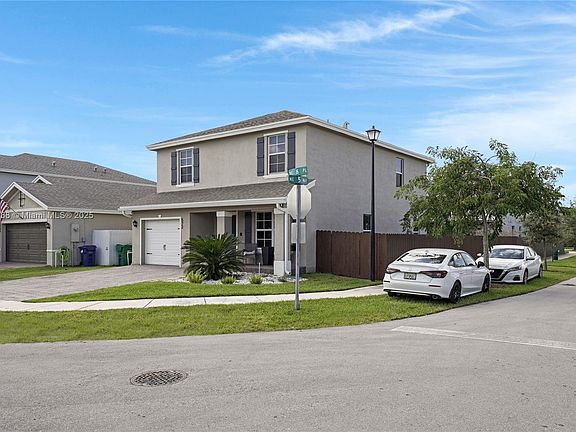 Beautiful corner home in Royal Homes West featuring luxury finishes and modern design. This 4-bed, 3-bath residence offers over 2,100 sq ft with an open kitchen, quartz countertops, and custom built-in entertainment wall. Wood-look tile downstairs, carpet only on stairs, and upgraded lighting throughout. Spacious fenced backyard with paved area and side gate — perfect for adding a pool, RV parking, or efficiency. Low HOA only $110 per month. Prime location near Florida City Outlet and US-1. Move-in ready and the best value in the community!