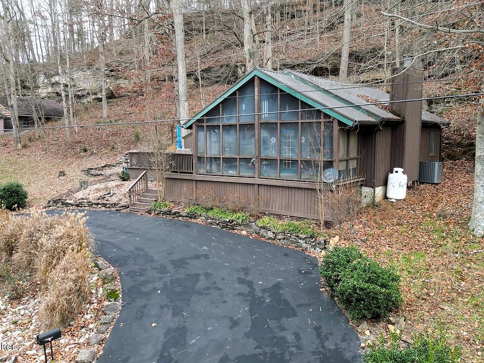 Own dockGas-log fireplaceBeautiful landscapingDetached storage buildingCozy retreatScenic cliff backdropPaved half-circle driveway