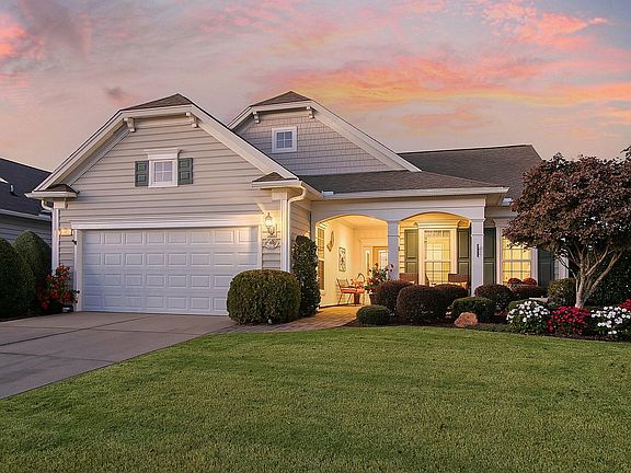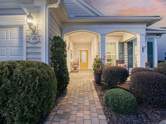 Beautifully-maintained and offering wonderful outdoor living space with water views, this 2 bed/2 bath with office home is sure to impress! A perfectly landscaped yard and paver patio front porch provides incredible curb appeal. Step inside to find hardwood floors extending through the foyer, living and dining rooms, office, and halls. The open-concept kitchen features 36'' cabinetry with crown molding, granite countertops, a gas range, and included refrigerator. A light-filled sunroom with tile floors and recessed can lighting is adjacent to the cozy living and dining rooms. Step outside to the extended paver patio with partial cover and enhanced landscaping that overlooks a wide lagoon with lighted fountain. Back inside, the Owner's Suite includes an ensuite bath with tile floors,double sink vanity, walk-in shower and separate soaking tub, and large walk-in closet. The guest bedroom and a full bath with a walk-in shower sit on the opposite side of the home down their own hallway. The French door office and laundry room with included washer & dryer and upper cabinets complete the inside space. Inside the two-car garage there is a pull down ladder leading to a large attic storage area. Be part of the incredible Del Webb Cane Bay community in a truly move-in ready home. With over 100 chartered clubs, a full-time lifestyle director and 20,000 square foot amenities center, you'll have everything at your fingertips! Start living your best retirement life today!
