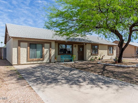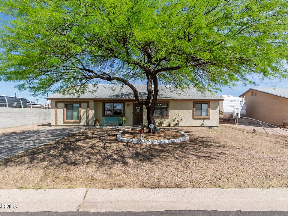Fall in love with this charming 4 bedroom, 2 bathroom home in Apache Junction! Discover an inviting interior displaying neutral tile flooring, vaulted ceilings, soothing palette throughout, and sliding glass doors opening to the back patio. The Galley kitchen features stainless steel appliances, white shaker cabinets, a chic mosaic backsplash, quartz counters, and stylish track lighting. The primary suite showcases plush carpet throughout, a private bathroom with dual sinks, and a sliding-door closet. You will find endless possibilities for customization in the vast backyard, offering a covered patio and immaculate mountain views! What are you waiting for? Don't let this opportunity slip by!