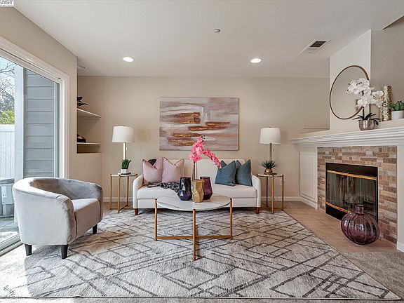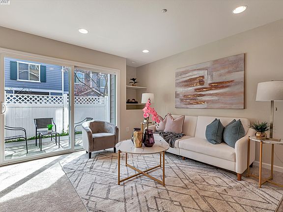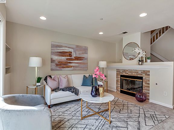 O/H 2/25-2/26. Excellent Fremont location for this stylish and updated 3 bedroom/2.5 bathroom California Blossoms two-story condo that includes an attached 1-car garage. Entry foyer leads to a light filled, spacious living room with a tiled wood-burning fireplace, recessed lighting, new carpet, built in shelving, and sliding door access to a private patio area. Beautifully updated kitchen with Quartz countertops, dramatic backsplash wall, stainless steel appliances, 5-burner gas cooktop/oven, pantry cabinet, wood laminate flooring, breakfast bar, and an adjacent dining area. Main level also features a ½ bathroom, laundry room, and under-stairwell storage area. Garage features plenty of storage cabinets and carpeted flooring. Primary bedroom with vaulted ceilings, recessed lighting, oversized closet, new carpet, and an attached ensuite bathroom. Other features include air conditioner, dual pane windows, premium blinds, and a freshly painted interior. Community amenities include prime community location near an abundance of guest parking, swimming pool, jacuzzi, and garbage service. Short commute to Silicon Valley and within 10 miles of Google, Yahoo, META/Facebook, &Tesla.