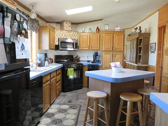 Take a look at this spacious 1960 square foot home on 1.39 acres. Also is a 960 square foot triple oversized garage with 10 ft doors, and a lean-to behind the garage for extra storage. There is lots of patio space to entertain, with an attached deck on the house. The home has steel siding, with all new windows; skirting is insulated wood. Lots of updates to the inside, including flooring and pine walls and pine accents in different areas. Very Cute and cozy! Two fireplaces plus two living and dining areas, so there is room to spread out. Take a minute to also enjoy the view. Bus stops at the end of the driveway, and delivers kids to Bell School, and also from there to Minot Schools.