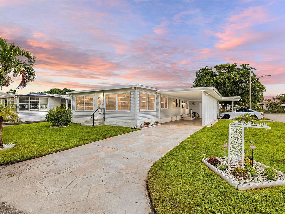 Step inside this spacious 2bed/2bath corner lot, double wide manufactured home in The Estates of Ft Lauderdale, ALL-AGES community where YOU OWN THE LAND! Features all brand new flooring going in , kitchen SS Appliances, refreshed bathrooms w/retiled showers, new lighting, freshly painted inside/out, roof resealed, A/C + water heater 2021, stamped concrete driveway, new carport privacy lattice, large shed, enclosed versatile Florida room in front but what truly sets this home apart is the in-law suite with kitchenette and own entrance + parking space in back, perfect for extended family, guests or rental potential. LOW HOA - $115/month. Enjoy resort-style amenities - pool, gym, sauna, golf, bowling, pickleball, tennis, and a full social calendar. Close to beach, shopping, dining, highways!