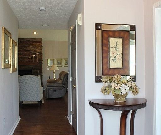 - Description: Inviting room for gathering with gas stone fireplace and lots of natural light,Flooring: Hardwood