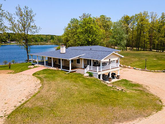 Frontage and/or access to 3 different lakes, one of which is all yours! Hunt, fish, or just get away. This ranch home on 55 acres offers 3 beds, 3 full baths, and has water views from every room! Secluded, rolling, mostly high wooded acreage. The living space on the main floor flows nicely from one lakeside to the other, and is surrounded by an expansive covered Trex deck. Newer windows and doors, efficient Geothermal heating & cooling, and pole barn less than 10 yrs old. Walkout basement provides more space for entertaining with a full bar, rec room, fireplace and full bathroom, as well as a patio just outside. RV hookup near the barn for extra guests, & trails in the woods to explore til your hearts content. This is truly a breathtaking getaway. Perfect for a family or executive retreat