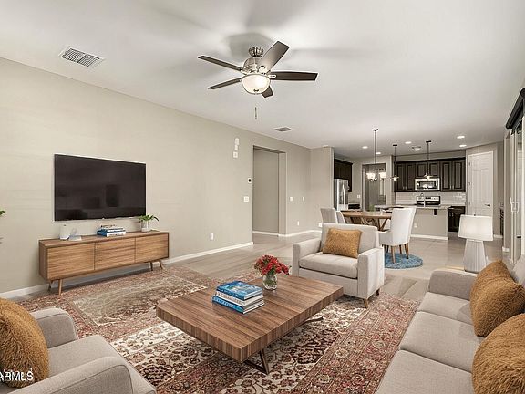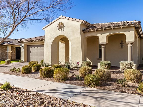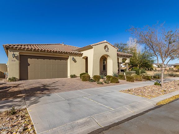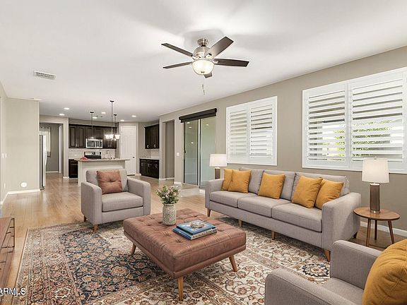 Situated on a Premium oversized lot siding to a green belt in Encore, a vibrant 55+ community. This extended Manhattan floor plan features a larger great room & 3rd bedroom along w/extended front porch, covered patio & 2ft garage extension. Inside you'll find shutters throughout, accent paint, & 8' interior doors. The updated kitchen features granite slab counters w/bullnose edges, subway tile backsplash, an island/breakfast bar, 42'' raised panel cabinets w/crown molding & hardware, a pantry & stainless steel appliances. A soft water system & utility sink in laundry room. This split floor plan features a spacious owners suite, large secondary bedrooms, one w/walk in closet. An extended covered patio w/travertine pavers, a synthetic grass area plus a 4 hole putting green. 2.5 car garage.. ...Garage cabinets and epoxy floors. Sweet fruit producing grapefruit tree in backyard.