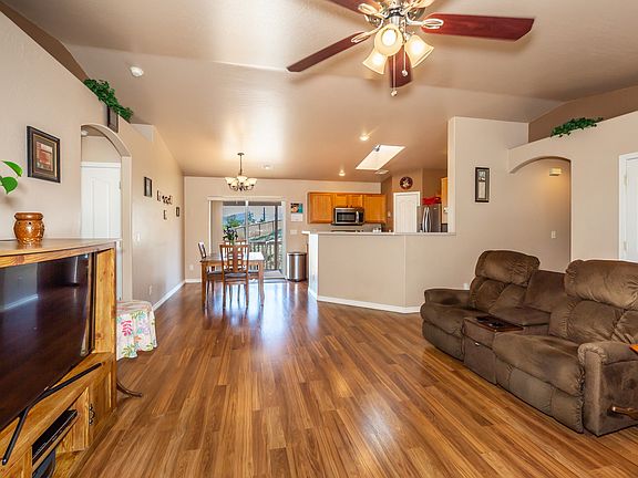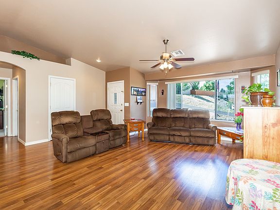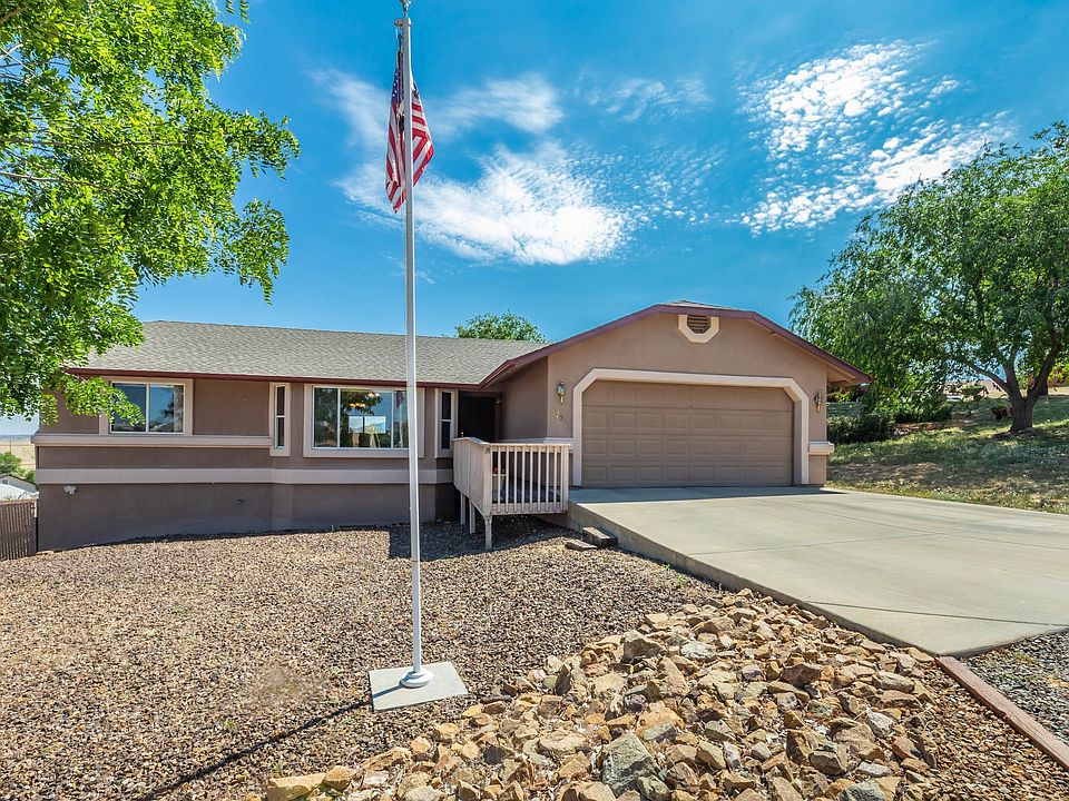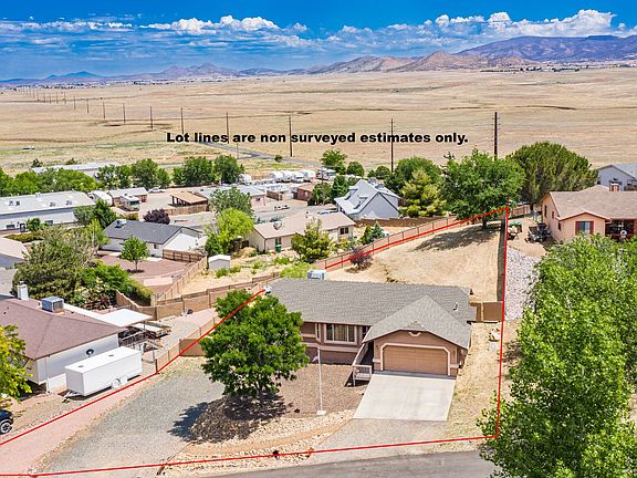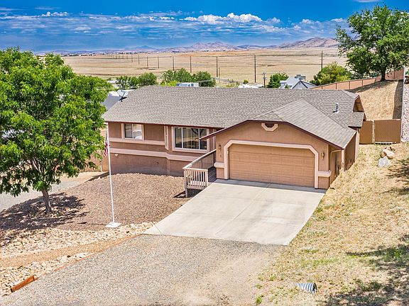 The small town of Prescott Valley is the perfect location to live! This property is centrally located to amenities in Prescott Valley and the highways leading to recreation or shopping in Phoenix or Flagstaff! This is a spotless, updated 3 bed 2 bathroom home with a split floorplan on an oversized lot! Upgraded flooring throughout, brand new stainless steel appliances and a remodeled master bathroom make this home more than move in ready! Front landscaping gives great curb appeal and the almost 1/2 an acre lot has a privacy fenced backyard! The views are captivating from the composite back deck! This home has a second driveway and drive in gate to the back yard providing RV parking. NO HOA! There is a full sized door leading you to a great additional unfinished area with electricity under