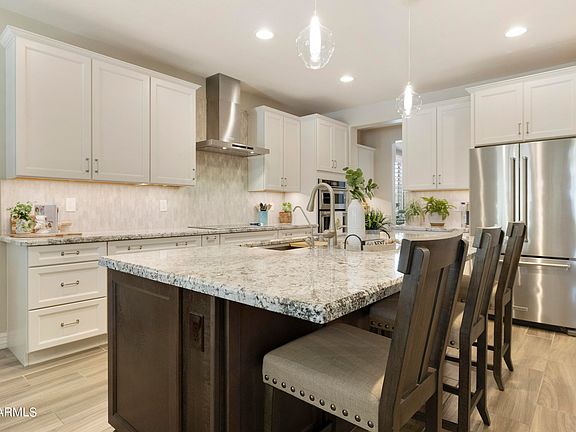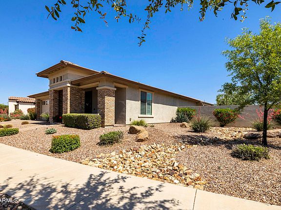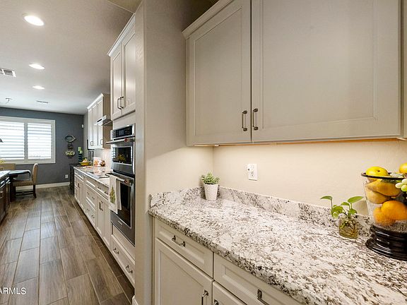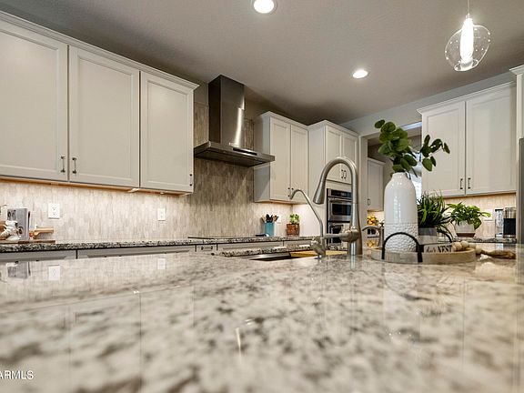 Stop the car! This hard to find Hollywood plan sits on a premium lot backing to a lush greenbelt & offers an entertainers backyard with a B-I BBQ island with pergola, expanded covered patio with gas fireplace, extended patio with travertine, a gas fire-pit for those chilly winter evenings, & lush landscaping. The inside won't disappoint either with 2 bedrooms, 2.5 baths, den with doors, a dining/flex rm, & great room with 12' slider. The gourmet kitchen has upgraded cabinets-with banks of drawers, upgraded granite, lg island wall oven & microwave with convection cooking, W-I pantry & butlers pantry. (Gas stub at cook top) The primary bath offers tile surround, granite counters, W-I closet with organizer. Shutters T/O & wood like tile in most rooms. Many many upgrades throughout! Encore is award winning with club house-w/workout facility, bocci ball, tennis & pickle ball courts & more!. This home is a must see!