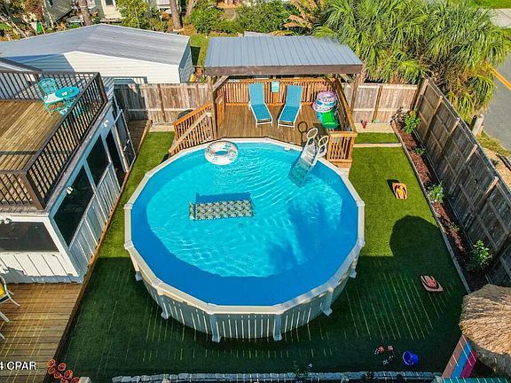 **CURRENTLY UNDER CONTRACT, SELLER WILL CONSIDER BACKUP OFFERS** Adorable, updated and upgraded ''beach house'' located in the desirable Biltmore Beach neighborhood in the South Lagoon area of Panama City Beach. A perfect home for a primary residence where others vacation, as a secondary vacation home, or as an income producing property for investors looking for an attractive, income-generating short term rental. ACTUAL gross annual rental revenue history (NOT estimated rental projections) of $91,714 in 2022 and $124,030 in 2023 for the current owners during their two years of ownership. This tropical oasis is located just four short blocks from some of the world's most beautiful, white sugar sand beaches and there's easy access to the boat ramps on Grand Lagoon just around the corner! The east PCB location is close to shopping, St. Andrews State Park and some of the best local dining establishments in the area. This well laid-out home boasts three bedrooms (with two bedrooms on the ground level) and two full bathrooms, as well as a spacious bonus room on the second floor, which can be used as an additional bedroom or living space that leads out to a large balcony overlooking the backyard pool, where you can relax and enjoy beautiful sunsets and the fresh Gulf breeze. The home has been recently beautifully renovated with LVP flooring and updated bathrooms and kitchen with stainless steel appliances and granite countertops. The fenced back yard offers serenity and privacy and is low maintenance with its artificial turf where you can play games in the yard and spend time with friends on the elevated, covered wooden deck adjacent to the pool or in the corner bench and high top table area shaded by a tiki umbrella. Your pets will even enjoy a special area to do their business. Leading out to the back yard, you can take a dip in the hot tub inside of the screened in patio room. There is ample storage and parking with one covered parking space along with enough room for five additional vehicles to allow for parking for friends and family or for vacation rental visitors. This beach paradise is offered furnished with calming coastal decor sure to delight you and your guests. (Please note that select personal items and furnishing/decor items are not included. Please see the list of items excluded from the sale under the listing documents.) As a short term rental, the home nicely accommodates up to 12 guests with its seven beds and comfortable furnishings. As a primary or vacation home, you'll feel like you are on vacation every day!
