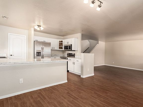 Your next adventure begins in this charming 2-story rental! Inside, you'll find wood-look floors guiding you into a spacious living room perfect for cozy nights or lively gatherings. The kitchen shines with stainless steel appliances, white cabinetry, generous counter space, and a center island with a breakfast bar for morning coffee or midnight snacks. Upstairs, a roomy loft opens to a balcony, ideal for savoring the mountain and neighborhood views. The main bedroom boasts its own private bath and a walk-in closet ready for your wardrobe dreams. This home is equipped with owned solar panels, providing significant savings on energy costs year-round. Also enjoy the comfort and convenience of a whole-house water softener. Out back, a covered patio overlooks a spacious yard! Don't miss it!