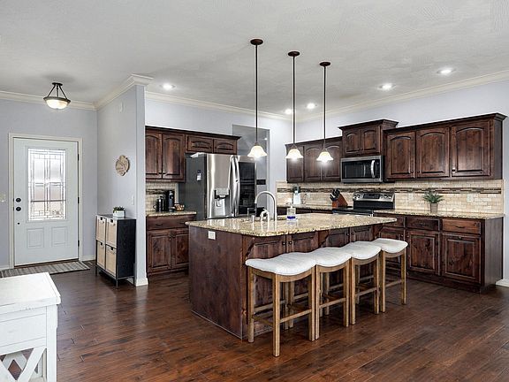Step into comfort and style with this charming freshly painted throughout Shelby Courtyard 4-bedroom, 2-bathroom home, 3 car garage, built by Bussell Building. Offering 2107 sq ft of inviting living space, this well-maintained home is perfect for families seeking both space and functionality. The open, split-bedroom floor plan is ideal for privacy and togetherness. The spacious living room with a cozy fireplace and rich engineered hardwood floors provides a welcoming atmosphere. The heart of the home, the kitchen, features custom Knotty Alder cabinets, some new stainless steel appliances, a pantry, and a large island--perfect for both cooking and entertaining. The master suite offers a peaceful retreat with a tray ceiling, a large bedroom, and an en-suite bath with dual vanity and 4-foot walk-in shower. Three additional bedrooms are generously sized, offering plenty of closet space. Outside, the privacy-fenced backyard and covered patio create a great space for relaxation and entertainment. Sprinkler system services both front and backyard for a lush looking lawn. The deep/wide driveway accommodates 5+ vehicles, offering extra space for guests or family. The newer roof (2020) & water heater (2022), energy-efficient features, including high-density insulation, Low E Argon windows, and a 16 SEER A/C unit, provide comfort and savings year-round. This beautiful home perfectly blends functionality, style, and comfort.