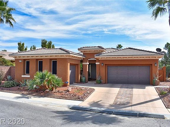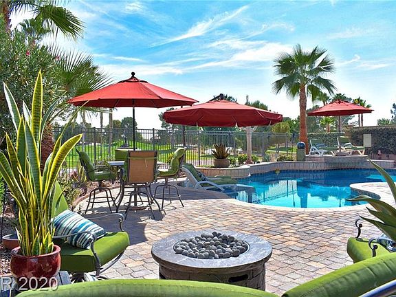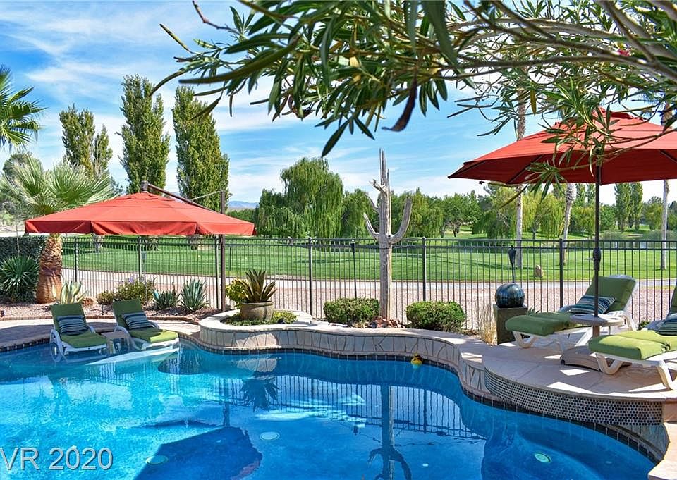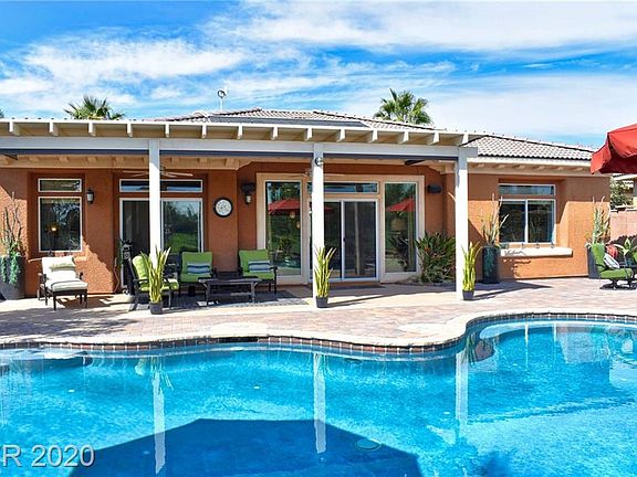 Stunning former model with in-ground pool, golf course frontage, & views of the pond on the back 9! Grown palms, courtyard entrance w/water feature, open kitchen w/formal dining, built-in entertainment center + surround sound, & solar-heated gunite pool w/waterfall! Primary suite offers 5-piece bath, tall ceilings, custom walk-in closet, & slider to patio/pool! Kitchen has granite tops, gas cooktop, double ovens, pantry, & formal dining with windows that look to patio/pool/pond! Pool has waterfall & baja shelf for loungers, & built-in umbrella w/arm. Fire pit, outdoor surround, built-in outdoor kitchen prep area, smart irrigation, & 3-car garage w/epoxy flooring & storage galore! Mtn Falls offers 18-hole golf, range, pro shop, restaurant, clubhouse w/billiard room, full gym, 3 pools, spa, & bar just 45 min from Las Vegas. Wineries, 2 tracks, endless trails, golf, casinos, & breathtaking views! Furniture & furnishings could also transfer w/acceptable terms for a true TURNKEY PROPERTY!