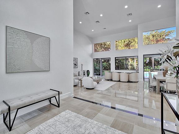 A stunning entry portico with flowers blooming and a massive double door invites you in to see the dramatic height of the smooth ceilings, marble floors, and then your eyes will see through the glass windows into the backyard paradise.