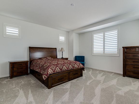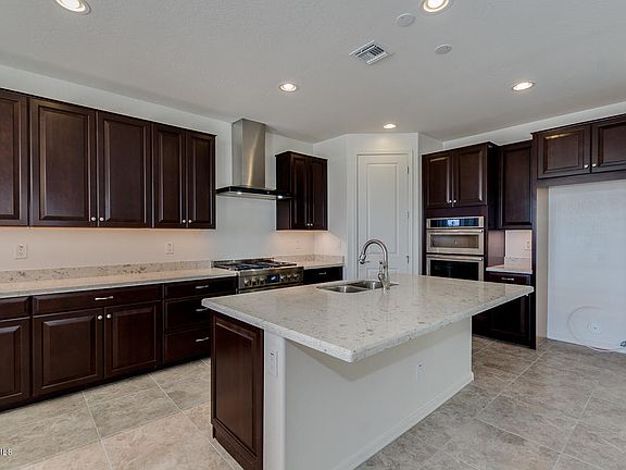 This beautiful home is located in the highly sought after Encore at Eastmark, allowing for full access to all the amenities this amazing development has to offer. This highly upgraded home features 42'' dark hardwood cabinets with light neutral quartz countertops. Jen-Air appliances, including gas range/oven and built-in second full electric oven/microwave combo. Tile floors and upgraded wood window coverings, including unique barn-door style louvered covering patio glass doors. As one of the rare homes that backs a greenbelt, this home has spacious, open views. Landscaping and water systems have been installed both front and back.