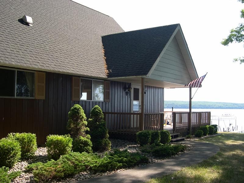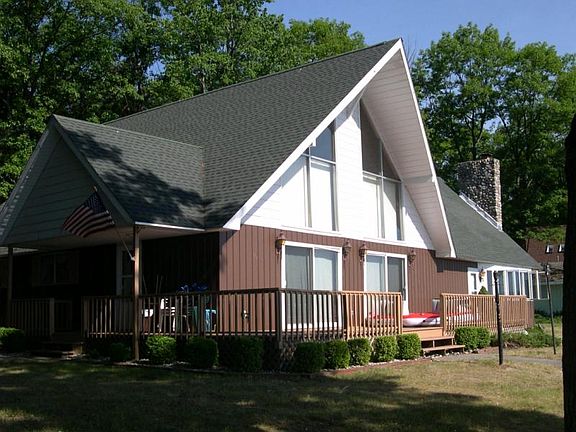 Spacious 4 bedroom, 4 bath home sitting on 150' frontage. Living room boasts an open lake view with two 8' sliding glass doors plus all glass in the peak above the doors. Air-tight free-standing woodstove. Oak spiral stair case leads you to the 2nd story; 2 bedrooms and 2 baths with a terrific full lake view from the balcony. Lots of counter space and cabinets in a U-shaped kitchen w/snack bar seating in dining area. Two bedrooms, 2 baths on the main floor. Utility room. Large great room with a natural stone fireplace, bar, pool table and Anderson windows lakeside; the perfect spot for entertaining. Entry has covered porch with deck that wraps around to the lake. 3-1/2 Car garage; storage shed, dock included. Plenty of room for everyone! 2018 Appraisal.