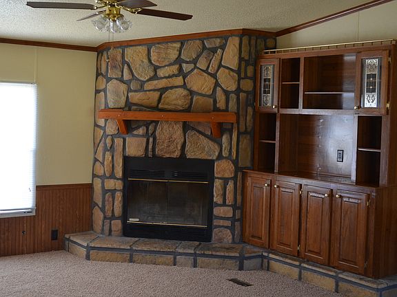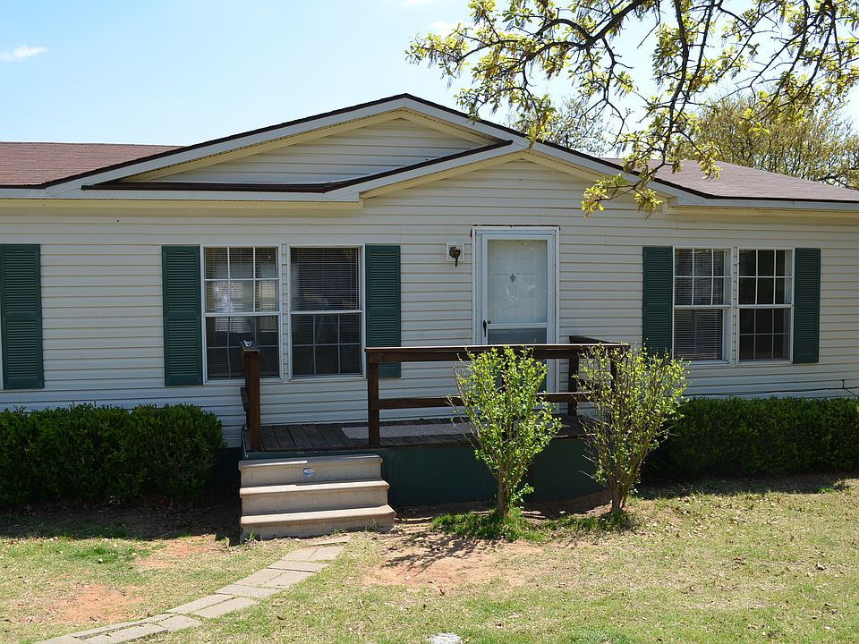 5 acres with nice steel shop (cement floor and electric), barn, nice storage building (cement floor and electric), a chicken coop, and storm shelter. Re-roofed about 3 years ago. Central heat, fireplace and AC. Fenced. Bring your horse, cow, chicken and ducks. There is plenty room for a pond and well suited to building your new home on the North side of the acreage.