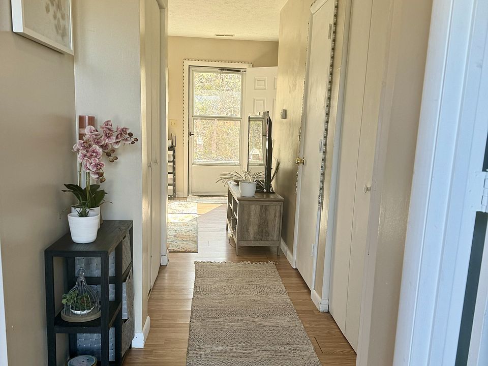 Two story town house with hardwood flooring in common areas and carpeted bedrooms. The apartment has central heating and cooling, dishwasher, washer / dryer hookups and private patio area. Tenants pay electric, water, and sanitary. Pet friendly with restrictions.