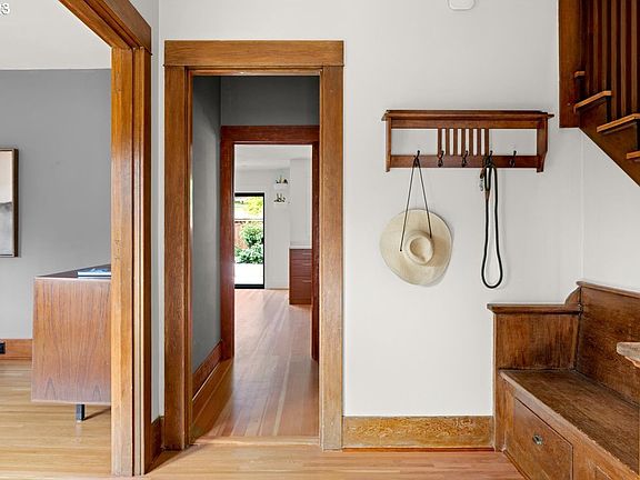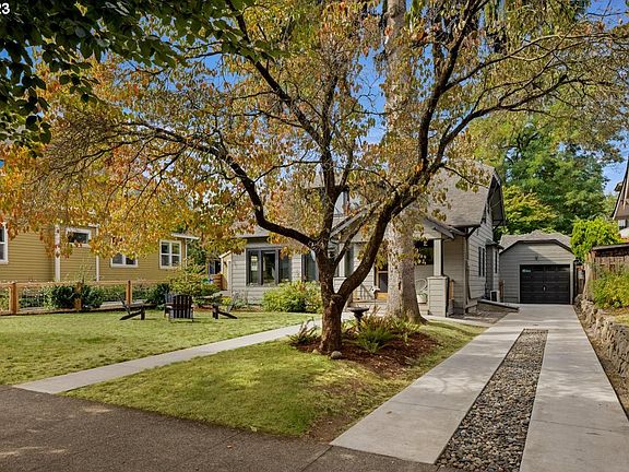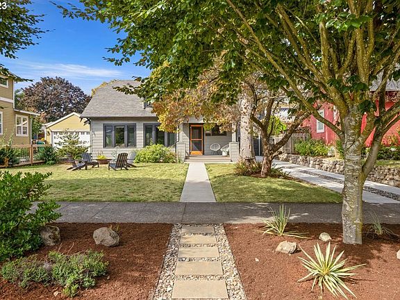 Architect's own fully restored 100-year old home rooted in high design and sustainability. Meticulously updated creating spaces as functional as they are beautiful while honoring its historic roots. The entertainers & chef's dream kitchen alike features custom walnut cabinetry, designer appliances, handmade tile, curated storage for appliances, in-sink chopping & drying racks, and an oversized island for gathering those that are important. The main level circular floor plan flows effortlessly from the kitchen to the dining room and backyard. Restored, original woodwork anchors the window-lined living room and carries you upstairs to a privacy door & period-piece built-ins. The upper-level features two well-appointed bedrooms, laundry room, and designer spa bathroom with floor-to-ceiling tile, heated floors, walk-in two-person shower, soaking tub, and custom double vanity. Functioning as its own guest quarters or an extension of a home as a family room, the finished and flexible basement hosts a full kitchen, full bathroom, washer/dryer hookup, exterior entrance and bonus area ready and eager for game day. With an oversized front yard and show-stopping backyard, gather friends for your annual bocce ball tournament, eat alfresco with herbs from custom built-in planter boxes, or simply retreat at the end of your day into the lush and private sanctuary. The extensive list of system updates include new plumbing throughout and water main, a newer heat pump system, updated electrical, EV charging ready, new high-performance wood interior windows, and improved insulation garnering an energy score of 9! Ideally located on a quiet street blocks from great eats, the bluff, and Arbor Lodge Park! Looking for extra space? Main floor room off kitchen was originally a bedroom, but currently staged as a dining room - easily could be 4th bedroom! [Home Energy Score = 9. HES Report at https://rpt.greenbuildingregistry.com/hes/OR10221685]