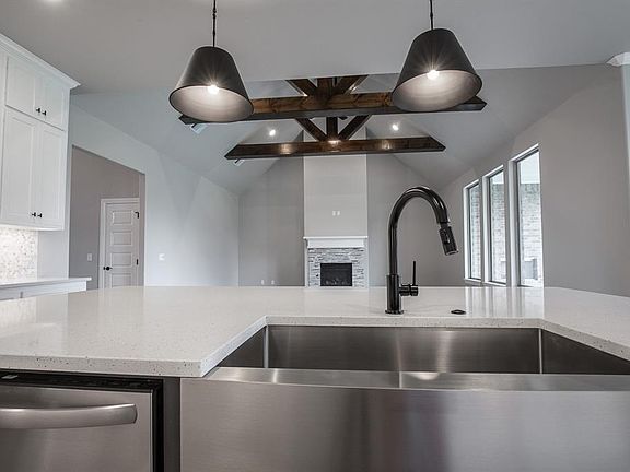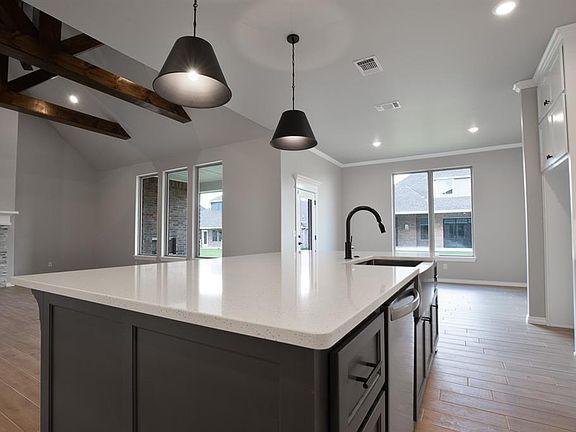This Wesley Bonus Room Floor Plan includes 3,630 Sqft of total living space, which features 3,285 Sqft of indoor living space and 345 Sqft of outdoor living space. There is also a 590 Sqft, three car garage with carriage doors and a storm shelter installed! This desirable home offers 5 bedrooms, 3 full bathrooms, 2 covered patios, a large bonus room, a powder room, and a utility room. The great room supports an immaculate cathedral ceiling with a crows feet detail, large windows that show off your back patio, a ceiling fan, wood-look tile, crown molding, and a center gas fireplace surrounded by our exquisite stacked stone detail. The upscale kitchen boasts stunning pendant lighting, a gas range, an electric oven, 3 CM countertops, vogue tile backsplash, well-crafted cabinets to the ceiling, a separate walk-in pantry, and a large center island that holds a roomy farm sink as well as a dishwasher. The primary suite provides a sloped ceiling detail, a ceiling fan, a plush carpet finish, and windows. Attached is the main bath which has a batwinged vanity, a large walk-in shower, a private water closet, a Jetta Whirlpool tub, and a HUGE walk-in closet! The covered outdoor living area welcomes a wood-burning fireplace, a gas line for your grill, and a handy TV hookup. Other included features for this elegant home include our healthy home technology, an air filtration system, a tankless water heater, double glazed vinyl low E windows with argon, R-44 and R-15 insulation, a fresh air ventilation system, and so much more!