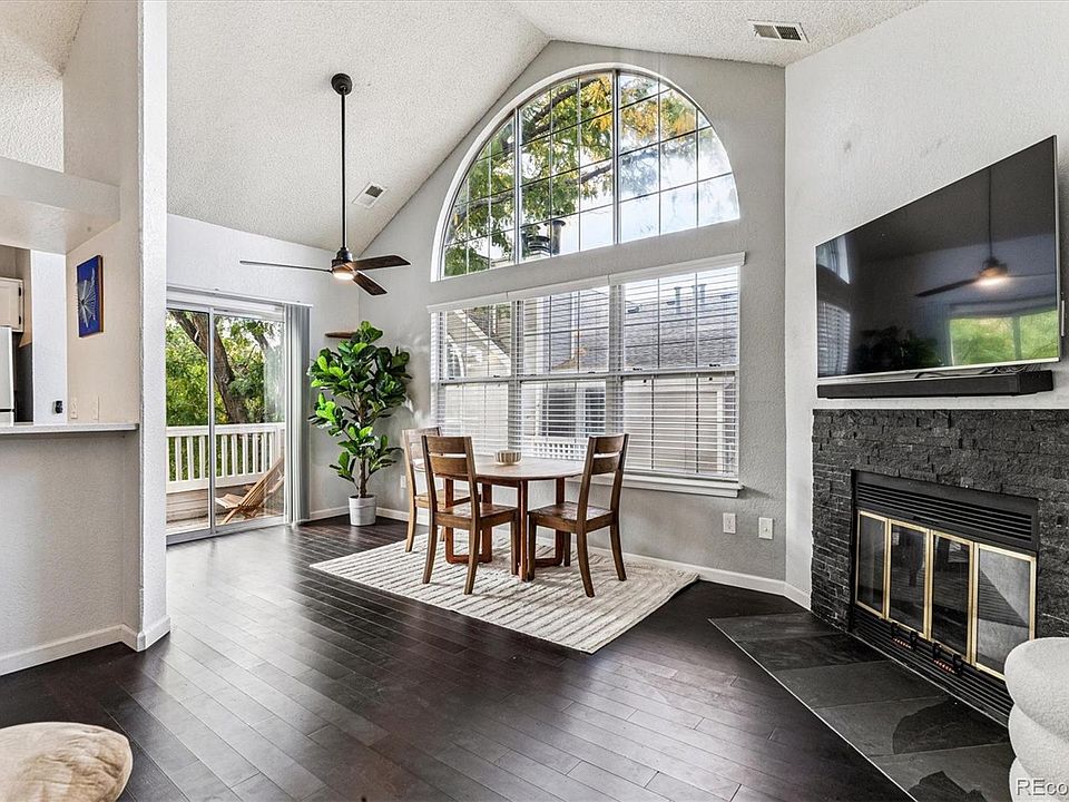 Come discover this beautifully refreshed top-floor condo in the sought-after Sunpointe at Lakewood Estates. Step inside to an airy, open living space where natural light pours through the dramatic arch window, accenting the 14-foot cathedral ceilings. A wood-burning fireplace creates a cozy centerpiece, while the newly updated kitchen impresses with quartz countertops, a sleek glass tile backsplash, stainless steel appliances, and an oversized sink that will make you rethink everyday living.