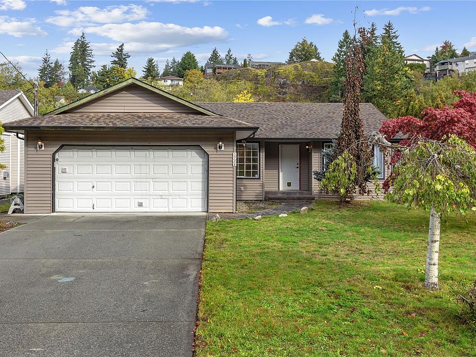 Welcome to Sunshine Ridge! Discover EXCEPTIONAL value in one of Nanaimo’s most sought-after neighbourhoods. This charming 3-bed, 2-bath rancher offers 1,350 sq.ft. of single-level living on a private 7,667 sq.ft. lot — complete with a STUNNING 600 sq.ft. cedar deck and beautiful mountain views. The bright, open-concept layout features a spacious living area with a cozy gas fireplace. The skylit kitchen features a stylish bar area and breakfast nook. Enjoy a fully fenced backyard IDEAL for kids, pets, entertaining, or quiet evenings outdoors. The attached double garage adds convenience and storage. Just steps to Brookwood Park, Linley Valley trails, schools, shopping, and transit, this home delivers the ideal blend of comfort and convenience. PERFECT for first-time buyers, young families, or those looking to downsize without compromising on quality. Versatile, affordable, and move-in ready. Opportunities like this don’t last long! OPEN HOUSE: Saturday October 18th, 1:30-3:30pm.