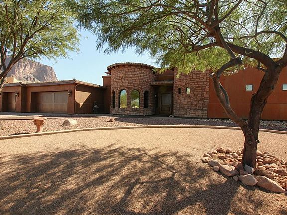 NO HOA! Exceptional custom home w/ panoramic mountain/city light views! Situated on 1.25 acres of serene desert landscape at the base of Superstition Mountain. Great floor plan perfect for entertaining. Inviting great room w/2 way gas fireplace, offers the ambiance of indoor/outdoor living w/ double sliding glass doors. Gourmet kitchen w/ staggered knotty alder cabinetry, granite slab counter tops, all stainless steel appliances, hammered copper hood above cooktop & breakfast bar w/ natural stone face. Rotunda breakfast room w/ domed ceiling & recessed light. 2 Master suites both w/ full baths (perfect for guest quarters). Bonus loft area, w/ rich hardwood flooring & balcony. Amazing rooftop deck is the perfect place to relax & enjoy the amazing views all around you. Truly one of a kind.