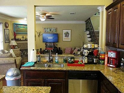 Two story home with covered porch. Formal dining area with exposed brick wall and beautiful wood floors. Kitchen boasts dark wood cabinets, granite island and countertops with plenty of natural lighting. Living Room includes fireplace and large windows. Stairwell with iron décor leads to three bedrooms and master suite with whirlpool tub and view of lake. Refrigerator, washer/dryer, and TV mount in living room may remain. Square footage taken from previous appraisal. Square footage to be verified by buyer.