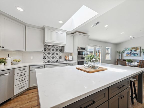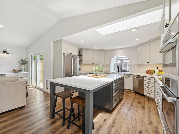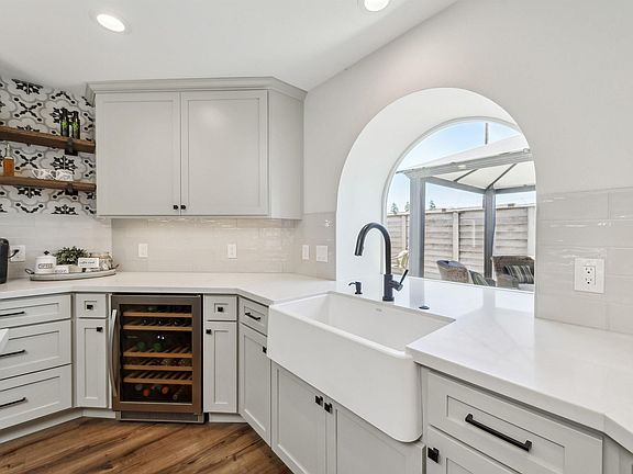 TURN KEY MOVE-IN READY ONE STORY! Step into the fully remodeled interior featuring large great room with soaring vaulted ceilings, stunning plank floors, oversized ceiling fan, recessed lighting, shiplap wood accent wall, and a custom built-in entertainment center. The kitchen is a chef's delight with custom cabinetry, stylish tile backsplash, large kitchen island with seating, premium Bosch appliances, and a built-in beverage refrigerator. Retreat to the cozy bedrooms, each with plush new carpeting, and ceiling fans. OWNED ELECTRIC SOLAR and OWNED POOL SOLAR provides energy savings year-round! French doors open to an amazing backyard oasis that’s meant for entertaining, complete with large pool, two pergolas, and storage shed.This home is ready for you to move right in!