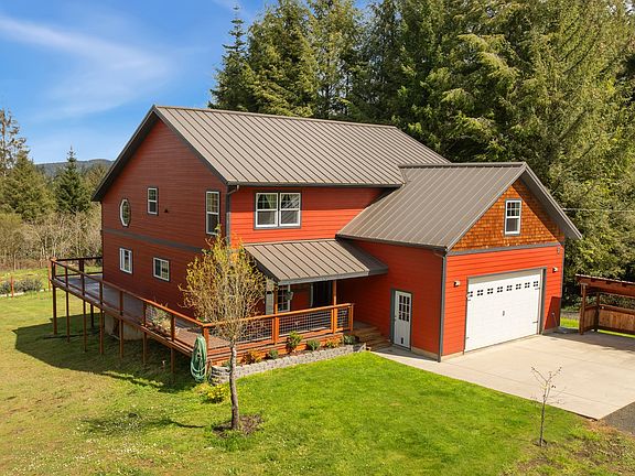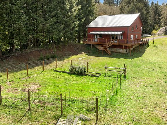 The Oregon Dream! This stunning 3-bedroom, 2.5-bath home on over 9 acres offers the perfect blend of privacy, comfort, and functionality—just minutes from Coquille. In addition to the 24x24 attached garage, a 36x36 shop/barn with water and power—perfect for projects, storage, or livestock. With 2,887 square feet of beautifully maintained living space, this home feels like new and was thoughtfully designed to be both welcoming and versatile. The main-level master suite offers easy living including age in place features. All living needs are on the first floor including den/office, half bath, living/dining, kitchen, and laundry. Upstairs features two spacious bedrooms, a full bath, massive family room, and a giant loft which provides endless options for work or play. The living room boasts a cozy propane fireplace framed by a gorgeous live-edge mantle, vaulted tongue-and-groove ceilings, and an open-concept layout filled with natural light and warm details. Outside, enjoy the peaceful setting from the wrap-around deck providing covered areas in both the front and back, ideal for relaxing or entertaining. The expansive yard includes an enormous garden area, apple, cherry, and plum trees, berries, a private forested area beyond and a creek running nearby. There’s plenty of room for parking, and the durable metal roofs on both the home and shop ensure low-maintenance living. Energy-efficient features include a ductless heat pump, zonal electric heat, and a propane fireplace, keeping the home comfortable year-round. Every inch of this property has been tastefully built and cared for, making it a rare find in today’s market. Sellers are downsizing, and this incredible property is ready for someone new to enjoy all it has to offer. 5 gpm well (when drilled), 2,500 gal holding tank, Standard Septic installed recently. This turnkey, beautiful country property has it all! Don’t wait—homes like this don’t stay on the market for long!