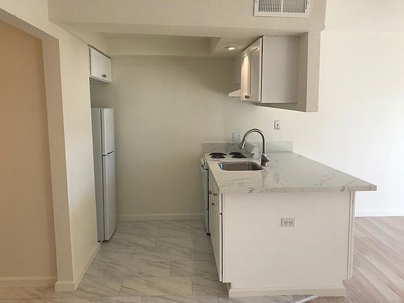 Fully remodeled studio apartment. Laminate flooring in the living area and tile in the bathroom and kitchen. New kitchen cabinets with quartz countertop. Completely new bathroom. Generous closet space. Private balcony. Assigned parking in gated parking area. Off street parking available as well. Month to month lease. Landlord pays for water, sewer & garbage