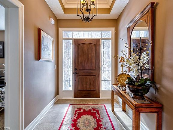 Luxury living in the thriving friendly village of Mount Brydges, just a 10-15 minute relaxing drive west of London. You'll fall in love, from the welcoming foyer with ceramic floor leading to great room with tray ceiling, hardwood flooring, gas fireplace, to the formal dining room great for entertaining. Bright kitchen and eating area offering plenty of cupboards, pantry, granite countertops, island with double sink and seating & patio door to covered deck overlooking the large yard. Master bedroom retreat with 5 piece ensuite complemented by a generous walk in closet. Convenient main floor laundry & unspoiled basement. Double car garage with inside entry and paver stone drive.