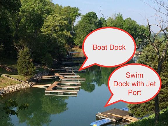 Fully Funished Lake front villa. The most affordable of all of Deerfield Resorts lake front homes! Great investment opportunity. Three levels of living space. Main level has an open kitchen, dining, and living area with a full bath and laundry room. Outside deck overlooks lake. Upper level is all Master suite with balcony. Lower level has 4 bedrooms, 2 baths, family room and deck with steps leading down to a large storage room. Concrete path to lake and uncovered boat docks. Dock slip & Jet ski port included.