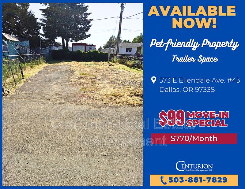 MUST READ MUST READ 1. The application process normally takes 1-3 business days. 2. Must see the property physically before the deposit is made. 3. If you have a pet, ESA or you don't have a pet you must register at https crem.petscreening.com 4. Apply to one property at a time. Address: 573 E Ellendale Ave. #43, Dallas, OR 97338 Property Type: Space (Manufactured Home) Rent: $770/mo Deposit: $900 on approved credit Application Fee: $68/ per adult 18+ Tenancy: 1 Year Lease or Month-Month RV Spaces AND ONE Mobile Home Space Available! Please note that we do not rent trailers; only spaces. Owner Paid Utilities: Water/Sewer/Garbage/Basic Cable Tenant Paid Utilities: Tenant is Responsible for Electric, Gas (If Applicable), And all Other Utilities Ready Date (tentative): Available Now! Laundry: Laundry On-Site Parking: Off-Street Parking Landscaping: Tenant Responsibility Pet Policy: Notice to all residents and applicants, everyone must complete the screening process. This is not only for pet and animal owners; it applies to residents and applicants who do not own pets. The pet policy includes caged animals and pets. Additional deposits and monthly pet rents will vary; keep in mind that it is subject to the approval of your petscreening.com profile. You will not be moved into the unit without this completed. Prices are subject to change, we do not guarantee prices, items change, and errors occur. If there is a discrepancy between a price online and a price in the office, supervising property manager shall have the final say. *Due to overwhelming demand we may be unable to respond to your rental inquiry. INTERESTED IN THIS PROPERTY? Properties are on a self-showing lockbox and each listing specifies how it is viewed. Feel free to drive by the property to check it out. "This information is deemed reliable, but not guaranteed." Centurion Real Estate Management, LLC 1365 Commercial St. SE Salem OR 97302
