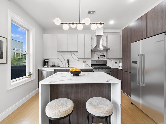 New construction home in elevator building with two private terraces! Welcome to 573 Palisade Avenue, where unparalleled sophistication meets breathtaking views in an exclusive collection of seven condominium homes in a boutique-style elevator building. Each two-bedroom, two-bathroom condominium home features spacious open floor plans of meticulously designed living space and private outdoor spaces. 10 - 14 ft ceilings soar above engineered hardwood floors, creating an airy sanctuary illuminated by recessed and custom light fixtures. The expansive triple pane Pella windows frame stunning vistas of the Manhattan skyline, inviting you to unwind against a backdrop of urban splendor. Kitchens feature custom 2-toned cabinetry, Samsung stainless steel appliances, Calacatta Laza Quartz countertops, wine cooler and direct vent exhaust hood. Bathrooms include Porcelanosa tiles with Kohler fixtures, deep soaking tubs and dual flush toilets. You'll love the convenience of having in-home laundry, integrated intercom and security system and a home that is prewired for home automation. Unwind and socialize on our exclusive residents rooftop lounge offering sweeping NYC views, providing an extraordinary backdrop for relaxation or entertaining guests. This property boasts unparalleled ease of access to New York City, making your commute as breezy as a walk in the adjacent Fisk Park. Whether you prefer the NJ Transit buses or the convenience of the 9th Street-Congress Street Light Rail Station right at your doorstep, your connection to the city has never been smoother. And with breathtaking views of the Manhattan skyline from your window, every day feels like a picturesque escape. This prime Jersey City Heights location offers you not just a home, but a lifestyle. Photos of staged unit.