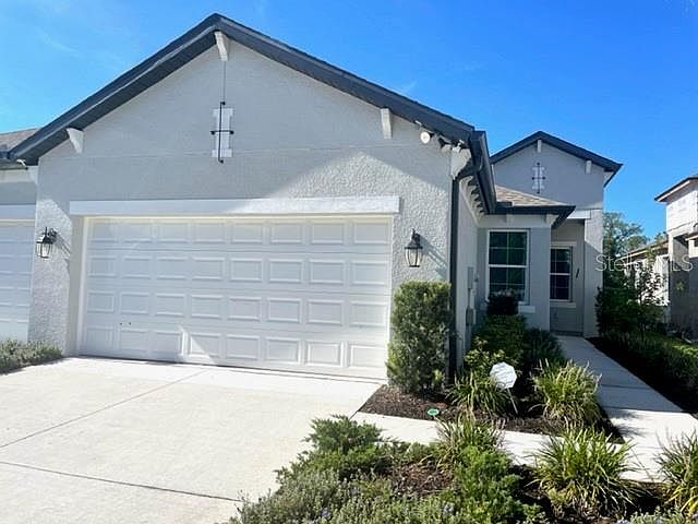 Beautifully built in 2019, this modern 2 bedroom 2 bath villa style home with a separate den/office is the perfect home. This was the builder's model so there are many upgrades. Amberly is a peaceful, gated community perfect for working from home or for commuters due to its proximity to I-75. This home provides open concept living with split bedrooms maximizing privacy. Relax on your lanai or enjoy coffee in bed in your master suite as you take in lake views and lush greenery. Enjoy cooking in a large kitchen with a walk-in pantry and modern appliances. Your laundry room is conveniently located off the kitchen and connects to your 2 car garage reducing the amount of sand brought in from the nearby award-winning gulf coast beaches you'll frequent! Enjoy your maintenance free lawn care, resort style pool with atrium, and the FL Suncoast lifestyle as part of your community amenities too! Conveniently located near shopping, restaurants, and family entertainment. This Ruby model is above the flood-plain in a FEMA designated Zone X with upgraded hurricane proof windows providing additional peace of mind.