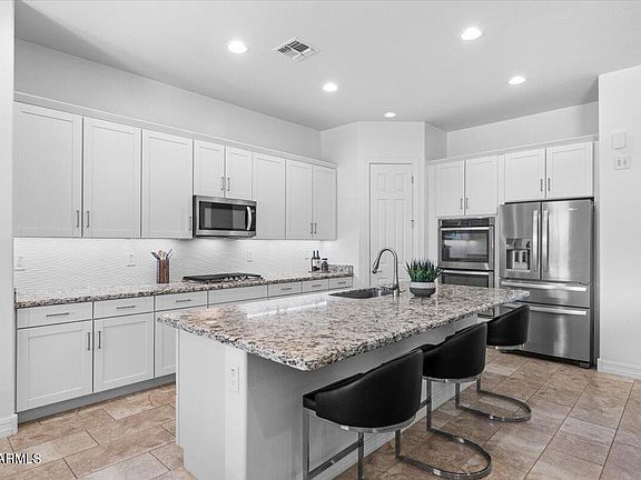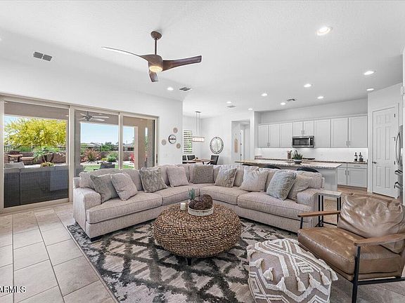 Enjoy living in the award-winning community of Encore at Eastmark. You can now own this desirable Cinema floorplan & private lot with gorgeous sunsets & greenbelt behind. All the right upgrades in all the right places including shutters, neutral carpet, designer ceiling fans, stylish lighting, newly installed guest bathroom shower & two new sliding barn doors. Entertain in the spacious living area with wide open views, delightful dining area, gorgeous island kitchen featuring white higher end cabinets, quartz countertops and stainless-steel appliances. Lounge and dine on your extended covered patio. Store your boat, toys & bikes in the 3-car garage. The club house provides pickle ball, tennis, bocci ball, activities, events and more...Now you have the perfect place to call home. (Additional features: gas fire/pit & sitting area, gas stub for BBQ & backyard pavers)