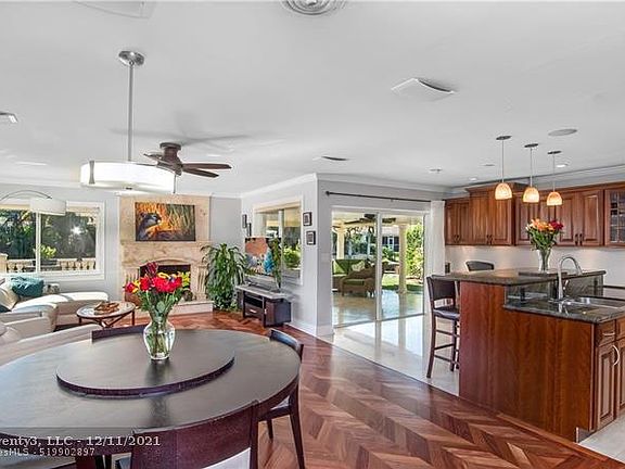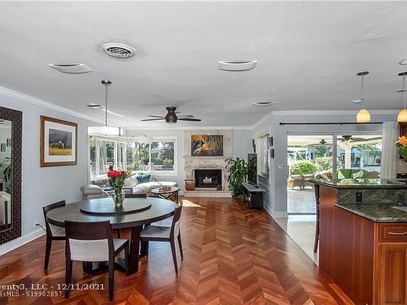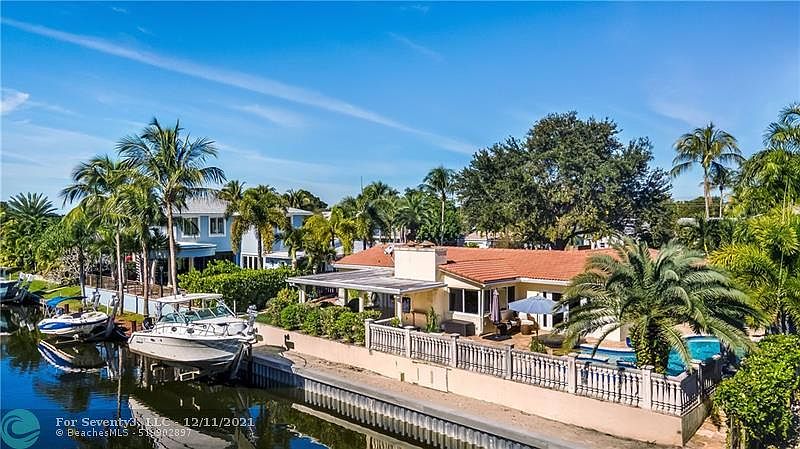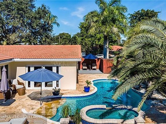 One of a kind private outdoor paradise! South Florida living at it's best: brand new seawall, ocean access with your own boat lift; free form heated kidney shaped pool with hot tub; travertine pavers, built in barbecue; composite wood deck, so many places to relax and entertain in fenced yard. Indoor remodeled to encompass open floor plan for indoor/outdoor living. Hurricane impact window and doors. Open area kitchen with island and workspace, and working fireplace in living area. Real Mahogany hardwood floors throughout with marble floor in kitchen. 3 of the 4 bedrooms have en suite bathrooms that are newly redone. Guest room with built in shelving that opens to Murphy bed, has private deck to relax on. Too much to list - must be seen! No HOA