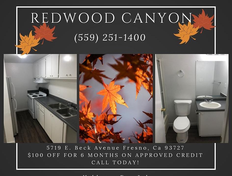WELCOME HOME! VISIT US TODAY! Redwood Canyon Apartments! Located/Ubicacion: 5715 E. Beck Ave. FRESNO, CA 93727 Office Hours/Hora de Oficina: Monday-Friday 8:00-5:00pm Phone/Telefono: (559) 251-1400 PRICES MAY VARY. SUBJECT TO CHANGE. PRECIOS VAREAN Y SUBJETO A CAMBIAR. 2 bedroom 1.5 Bath Up and Downstairs Available As low as $775 and up! Located on Clovis and Kingscanyon Application fee: $30 per adult $200 holding fee that is refundable if you do not qualify. - Separate money orders. $0 Deposit OAC (On approved credit) NO PETS NO SECTION 8 Tenemos 2 Recamaras y 1 Bano y medio (Planta baja y alta) De $775 para arriba! Localizados por la Clovis y Kingscanyon Cuota por Aplicacion: $30 no reembolsable $200 para reservar (reembolsable si no califica) Money Orders separados. $0 Deposito con credito aprovado. NO MASCOTAS. NO SECCION 8