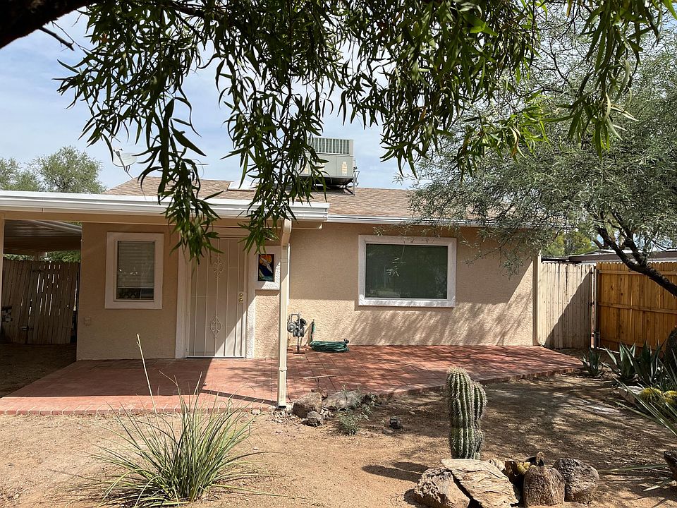 Freshly painted home, on a quiet street in central Tucson, with vaulted ceilings, all new flooring, new appliances and ceiling fans in every room. Featuring an extra large master bedroom with walk in closet and double shower in the ensuite bathroom, and a sliding door to a covered patio. There is a large laundry room with washer and dryer included. Covered patio off back door with natural gas connection for a grill. Mature landscape in front yard and a fully fenced back yard with small utility shed for extra storage or a workshop. Parking for 2 cars, with a carport for one car. Close to TMC, Costco and Grant Square. Tenant responsible for all utilities. Tenant must maintain landscape. Pets ok with a $200 non refundable pet deposit. No smoking inside property.