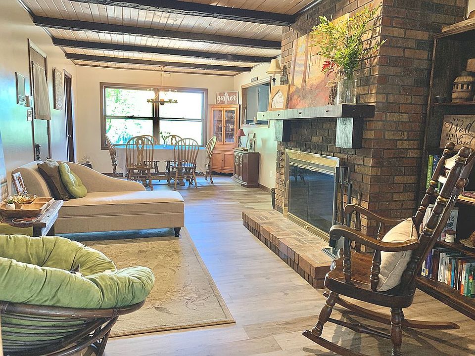 Beautiful brick rancher perched up on hill. Sits on 8.42 acres of evergreen wood and open field land with beautiful wildlife. Ideal for folks with horses! 3 BR, 2 1/2 bath, kitchen, living room, den/dining room with wood burning fireplace, sunroom, and laundry room. 2 car garage on main level, 1 car garage on basement level and Detached workshop with 1 more garage. Only 5 minutes to interstate. Flat, spacious backyard great for kids to play in or adults to wind down in total privacy. Full unfinished basement.