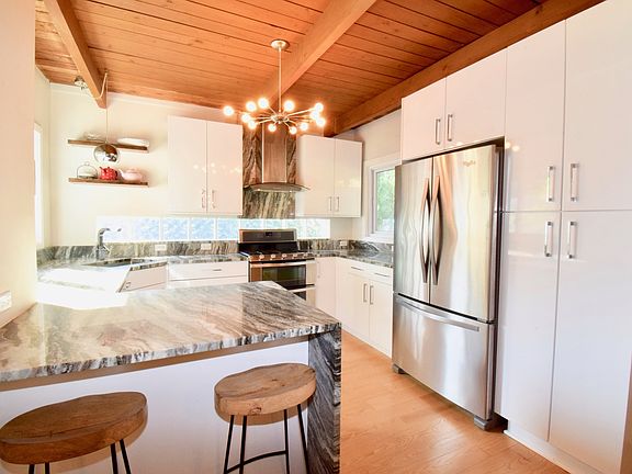 Completely updated Mid Century Modern home. Designed by architects: Alexander Henry Spitz & Warren Edward Spitz. Floor to ceiling windows and open beam ceilings. Reworked floor plan to allow for open concept living. Updates include NEW: electrical, plumbing, insulation, AC, furnace, roof, washer, dryer, appliances, hardwood floors, completely updated kitchen and baths. Two wood burning fireplaces and huge, private, fenced-in wooded lot. Close to town, schools, parks, and highways. This is a fabulous home in a fabulous neighborhood!