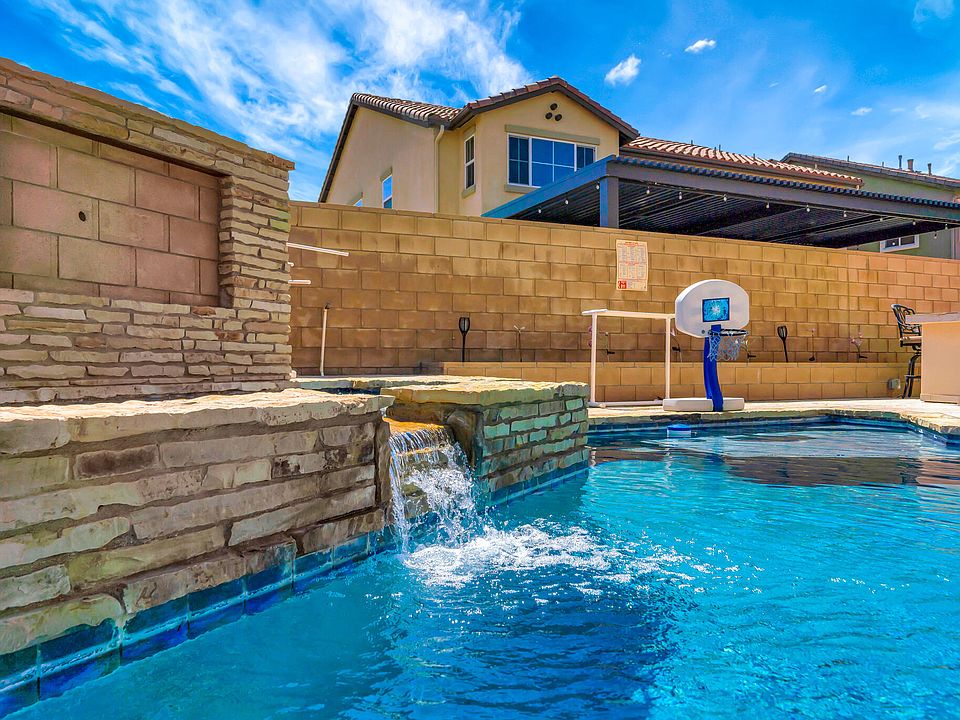 Welcome to Paradise! This Stunning Pool Home Features 5 Bedrooms, 3 Bathrooms & 3,767 Sqft. of Living Space, Sitting on a Large Lot. Downstairs Offers a Movie Room/Den/6th Bedroom, Large Laundry Room, Formal Dining Room & Living Room. Spacious Family Room with a Fireplace that Opens to the Gorgeous Chef Kitchen. The Kitchen Features Granite Counter Tops, Stainless Steel Appliances, an Abundance of Cabinets for Storage, Large Pantry & a Breakfast Bar. Upstairs Offers a Spacious Loft for Entertaining, Large Master Suite Featuring a Sitting Area with a Dual Fireplace that Opens to the Bathroom. The Bathroom Offers Dual Sinks, Large Walk-In Closet, Jacuzzi Tub, & Separate Shower. Four Additional Bedrooms with Large Closets & a Guest Bathroom. Indoor Laundry Room, an Attached 3 Car Garage. The Backyard is an Entertainer's Delight! This Gorgeous Backyard Offers a Custom In-Ground Pool & Spa, Freestanding BBQ, & Block Walls. Come See Why It's Not Just a House It's Your Home.