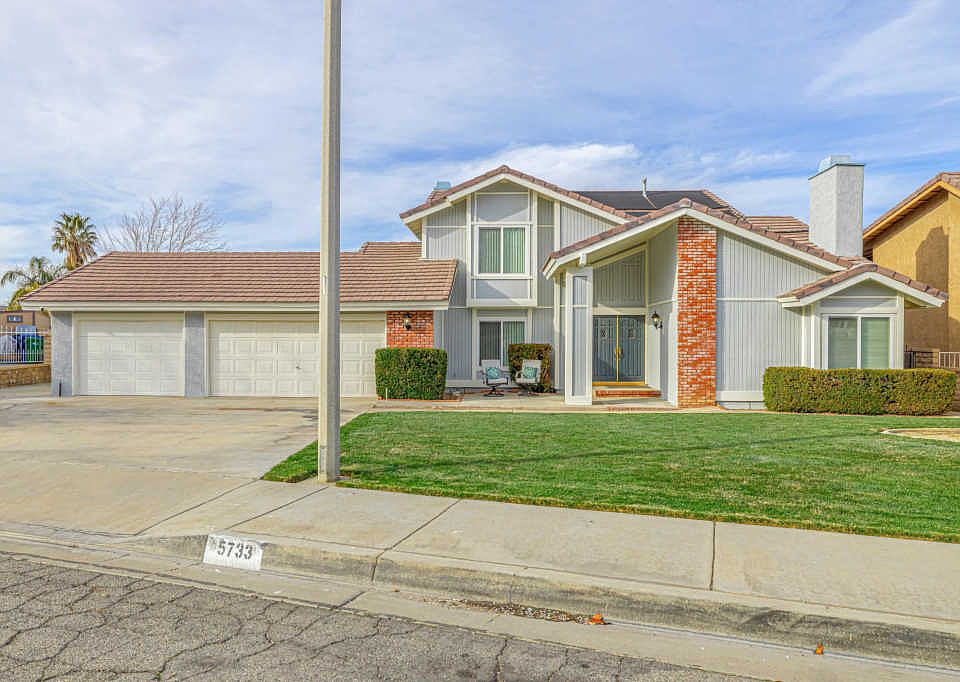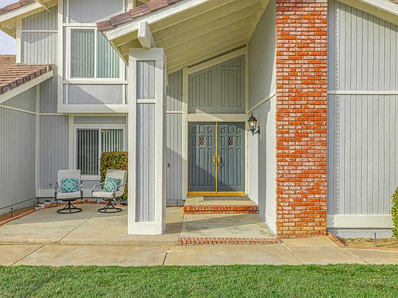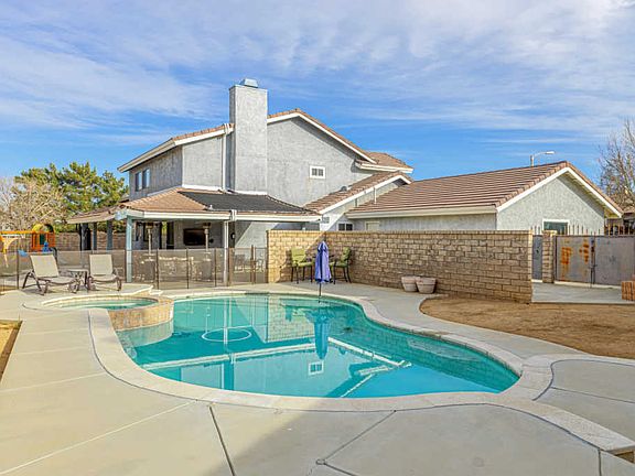 Honey did you know about this neighborhood?! This Quartz Hill pool home is looking for a new family to love! Volume ceilings, 2 gorgeous red brick fireplaces, commanding staircase and newer vinyl wood look flooring just starts the list of amenities. The spacious kitchen boasts picturesque windows, granite countertops, double ovens, breakfast bar dining and large butcher block center island. The downstairs bedroom, adjacent to a full bathroom, is perfect for guests. Upstairs you are greeted to a gorgeous primary retreat complete with volume ceilings, large bathroom and 3 walk in closets and dressing area. The secondary bedrooms are amply sized and perfect for your growing family. The outdoor living at this home is the place to be! Enjoy the desert sunsets on the large covered patio and take a dip in the solar and gas heated pool! Welcome home!