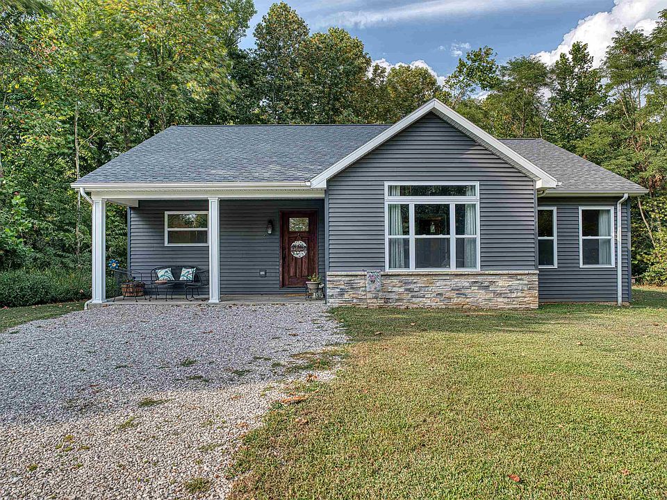 Don't miss out on this gorgeous ranch home nestled on 3.68 acres ideally located just minutes from all the conveniences of NEWBURGH! Modern amenities await you in this three bedroom, two bath home with over 1,600 square feet of living space, custom built in 2017 by Reinbrecht Homes. The functional layout features a beautiful open-concept kitchen, dining and living room area and split bedroom design. Just a few of the many highlights include a large covered front porch, convenient entry foyer, oversized kitchen island, attractive stone fireplace, and hardwood flooring throughout. Step into the primary bedroom and discover a peaceful, private oasis overlooking the wooded back of the property. Continue into the primary ensuite and find the lovely tiled walk-in shower and large walk-in closet (which includes the conveniently located washer & dryer hookups as well as custom shelving). Bedroom two (with impressive vaulted ceiling) and bedroom three are located near the front of the house along with the shared full guest bathroom. Accessed from the living room to the back, you will find a covered patio as well as a large wood deck, perfect for morning coffee, quiet evenings and entertaining. The home has been very well-maintained and must be seen to be appreciated! An area of cleared yard adjacent to the front porch could potentially be used as a location for a garage. The abundance of gorgeous wooded property rounds out this wonderful, move-in ready home!