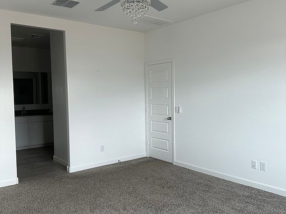 Situated on one side of the house, the primary bedroom serves as a tranquil retreat. It boasts a spacious layout, a walk-in closet for ample storage, and an en-suite bathroom equipped with modern fixtures. The en-suite includes a large shower, dual-sink vanity, and elegant finishes, providing a luxurious space to unwind.